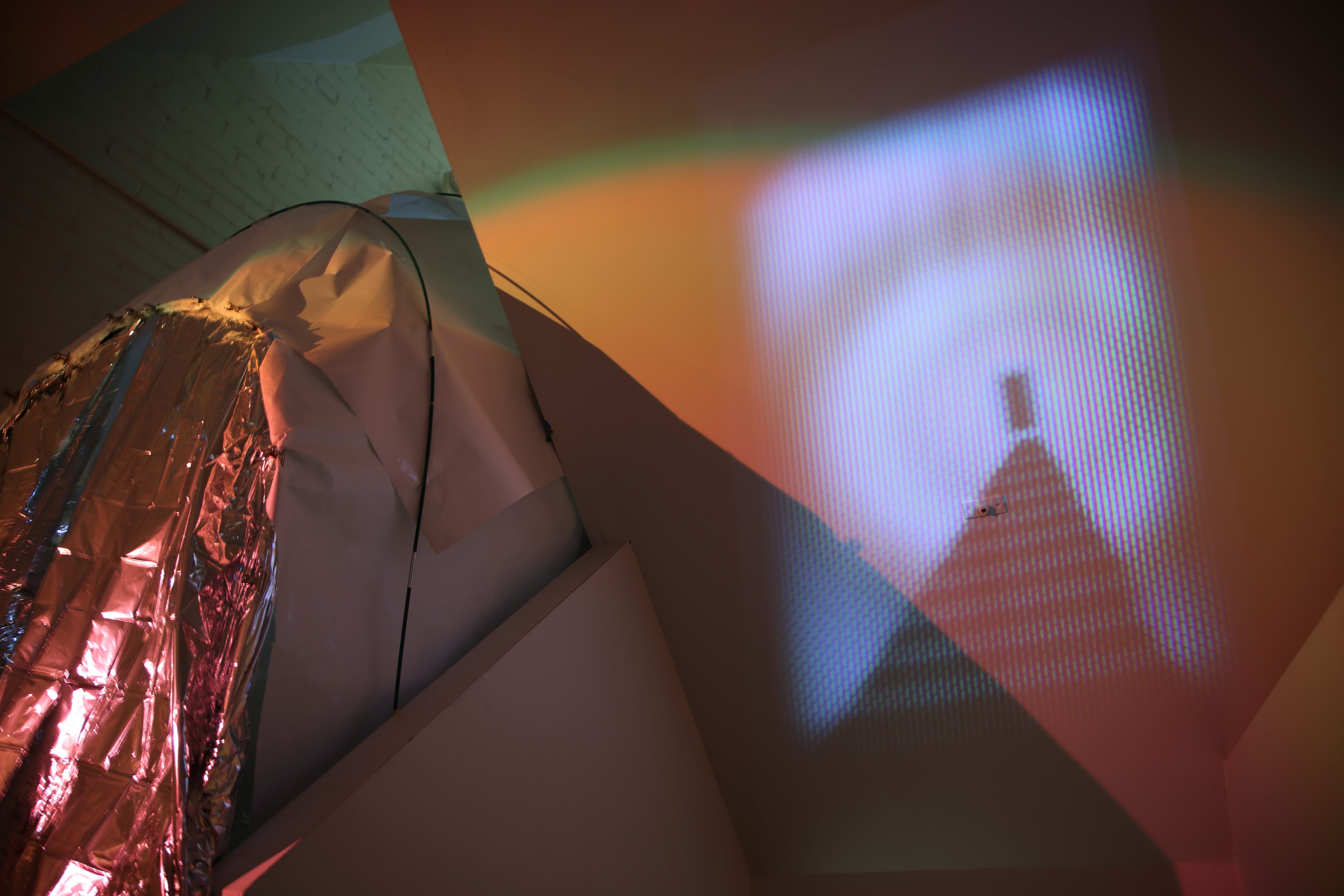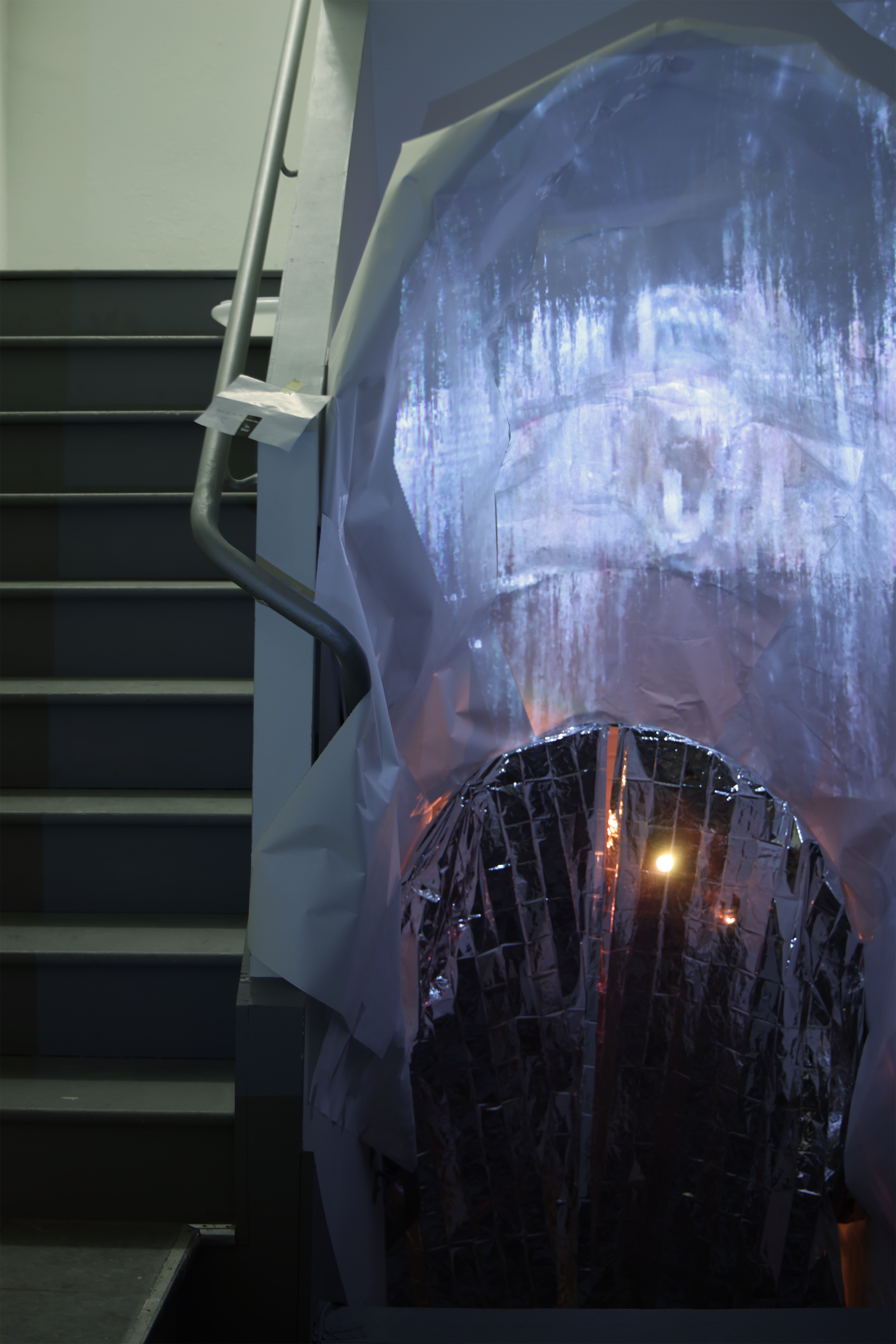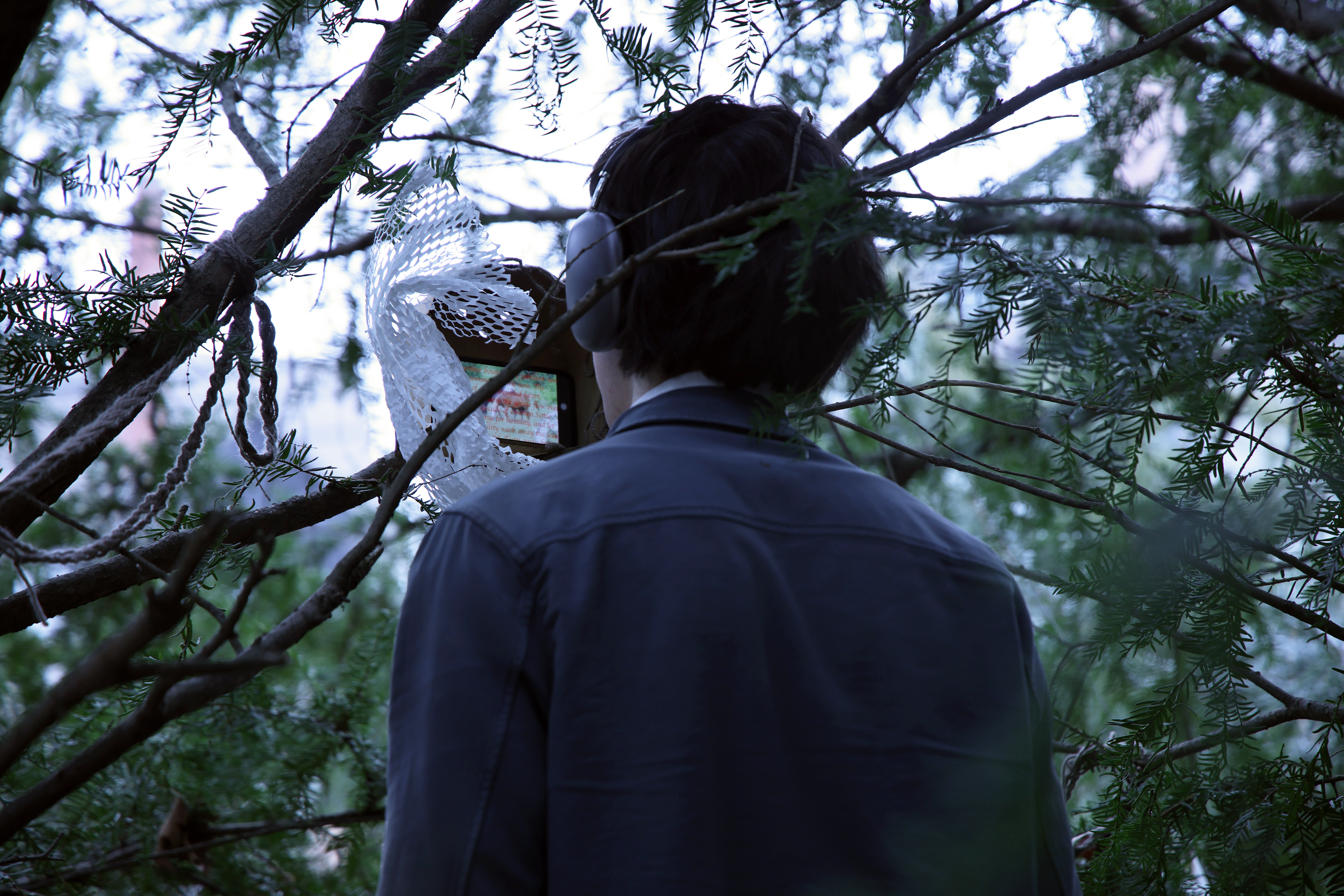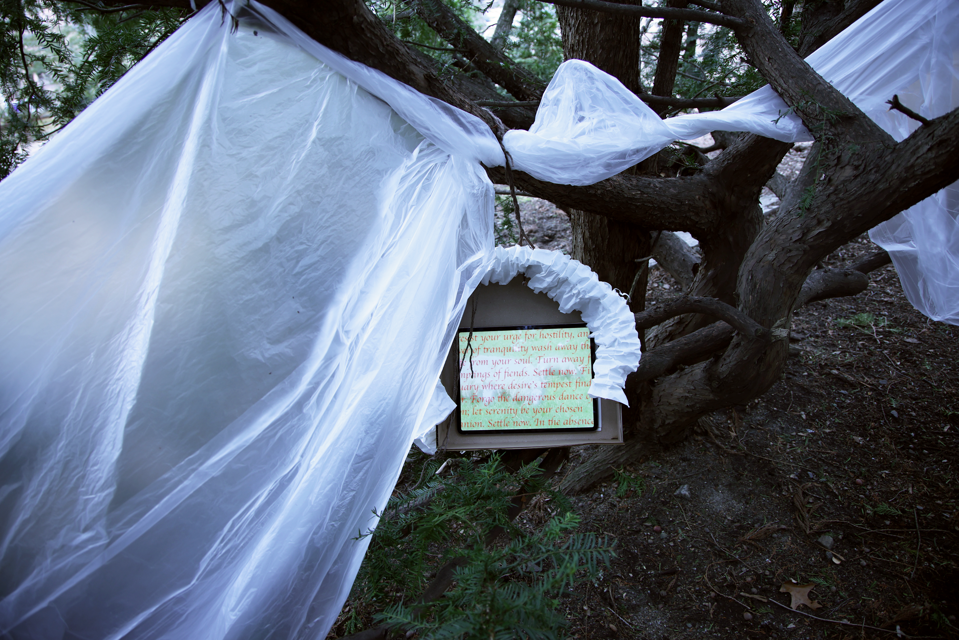 In a space separated from society by a myriad of trees, the viewer is guided by a soundwalk, placing them in the consciousness of someone leaving society, joining this utopia. They are led along a path through the woods to the installation space, which engages with all the viewer’s senses, making this process tangible. The viewer sits alone, strapped to another’s consciousness, lulled into a new way of being.